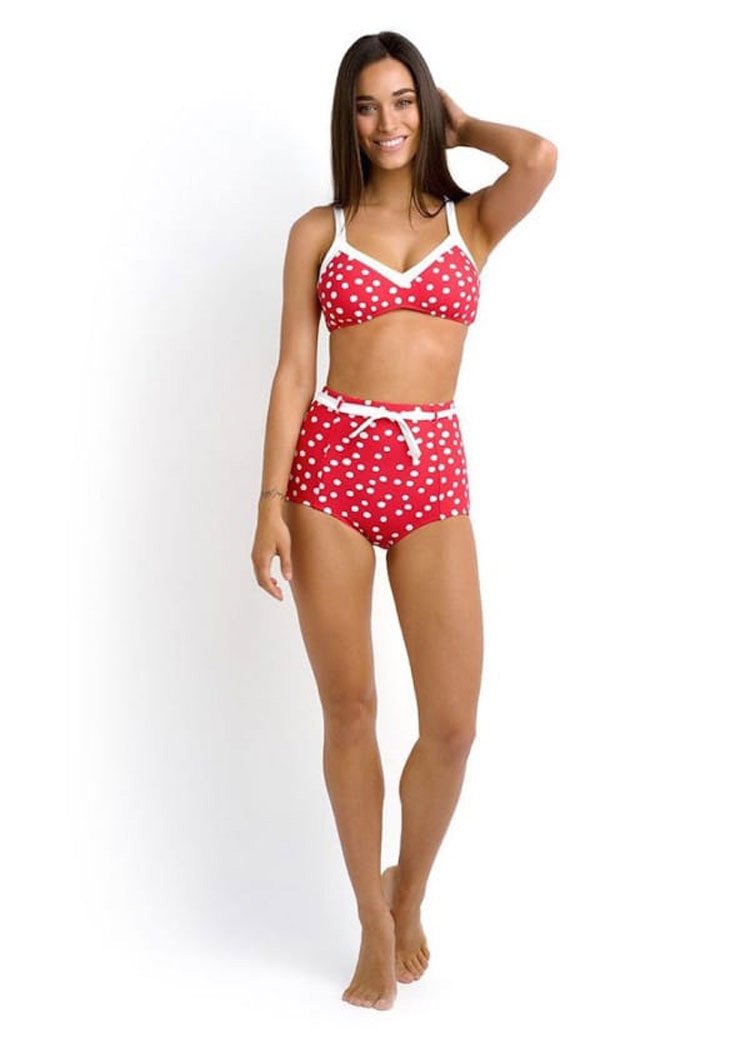 Este estilo retro cuenta con un bikini de color rojo brillante y una parte inferior de talle alto con lunares blancos.