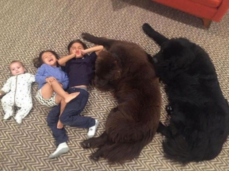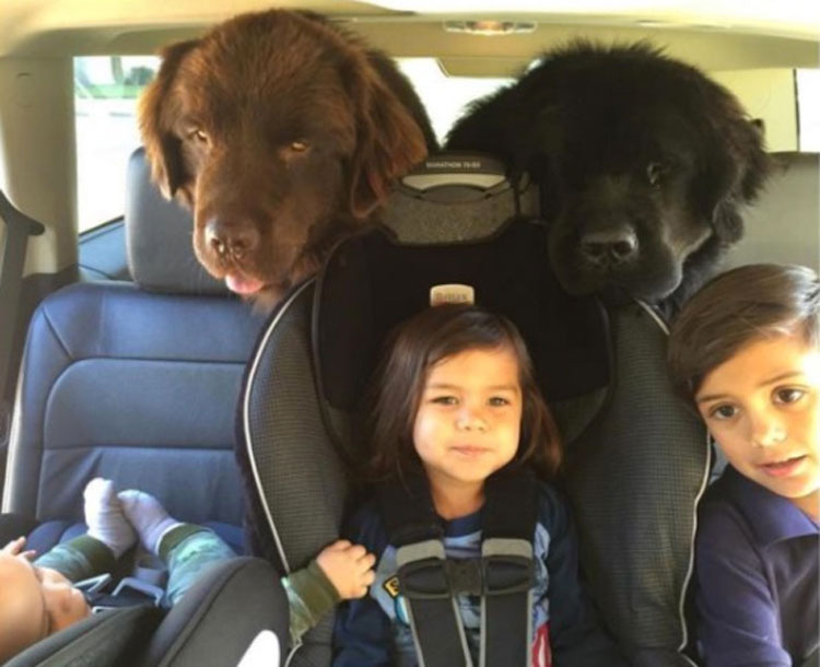 Joshua y su esposa, Bee, hicieron su investigación y se dieron cuenta, de las razas que eran famosas por llevarse muy bien con los niños. Esto a la larga les llevó a adoptar un par de Terranova. Si nunca has visto uno antes, te diremos que el tamaño de un Terranova puede ser bastante sorprendente. De hecho, estos perros son capaces de crecer hasta 1,80 m. de longitud, ¡lo que es más que la altura de la mayoría de los humanos adultos! Los Fisher nombraron a sus nuevos hermanos caninos Ralphie y Boss, y estaban encantados de ver que al instante se llevaban bien con sus tres niños pequeños.