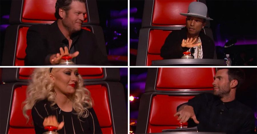 Lo que es aún más sorprendente es lo que hacen los jueces a los pocos segundos de empezar su canción, a la cuarta nota los cuatro jueces están tan desconcertados por su talento que se apresuraron a pulsar el botón rojo grande. Christina Aguilera, Adam Levine, Pharrell, y Blake Shelton todos querían tener con ellos el gran talento de Riley.