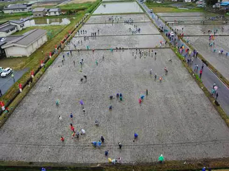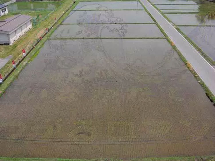 Cada abril, los agricultores esbozan un diseño y usan ordenadores para planificar exactamente dónde debe situarse cada planta en los campos de arroz de 15.000 metros cuadrados.