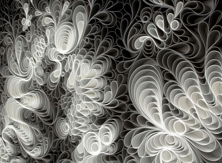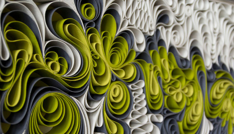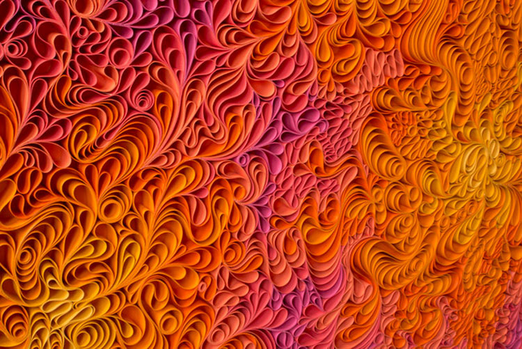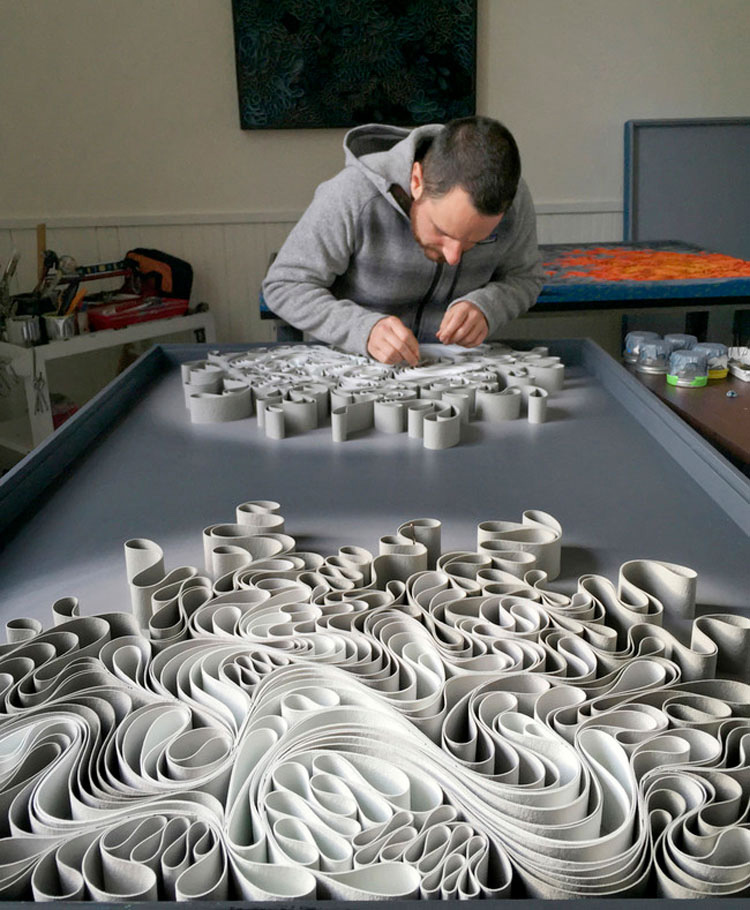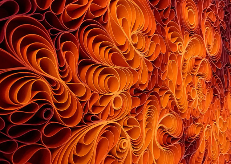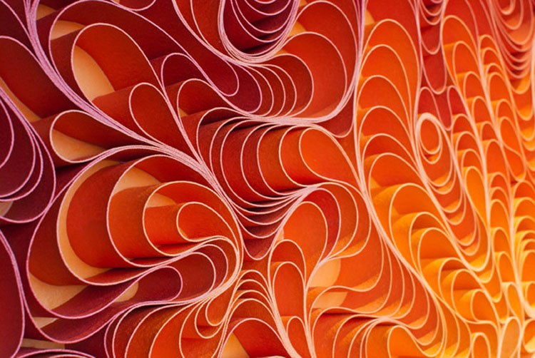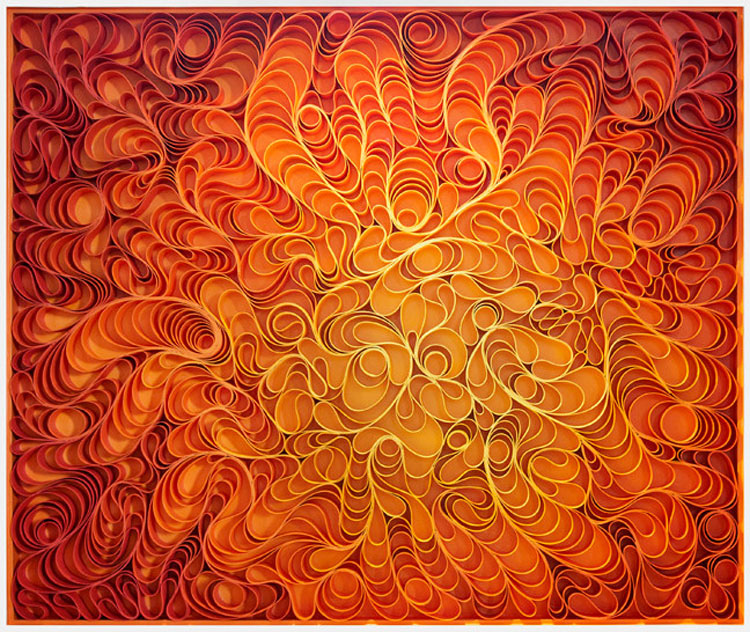 Stallman lleva tiras de lienzo pintado y crea bucles y remolinos que juntos se convierten en imágenes abstractas.