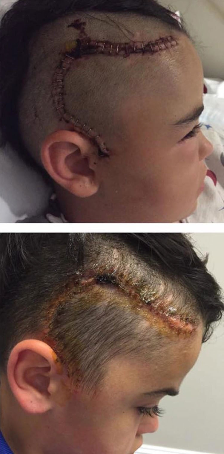 Las imágenes de después de la cirugía, muestran las 32 grapas que tuvo en la cabeza, y la eliminación de éstas grapas el 13 de abril de 2016.»