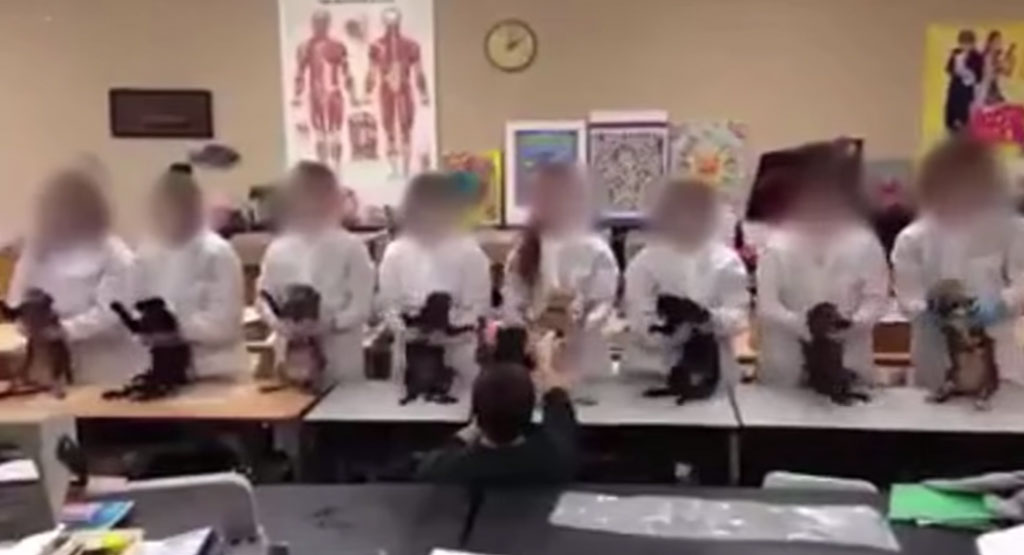 «PETA ha obtenido un inquietante vídeo que al parecer fue filmado en una clase de biología por el alumno con mejores calificaciones de la Harding Charter Preparatory High School de la ciudad de Oklahoma«, dijo la organización.