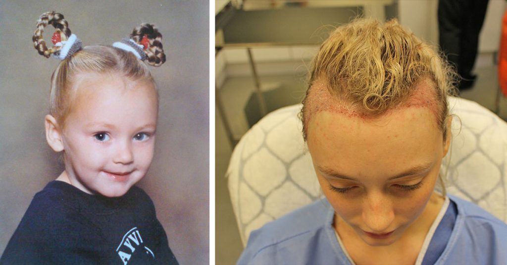 «Fui acosada por la línea de mi cabello en la escuela primaria y en secundaria, pero se puso muy serio cuando cumplí 13 años. Era completamente consciente de ello y hacía todo lo posible para ocultar la zona. Me afectó mucho, sobre todo cuando estaba recogido. Recuerdo las palabras exactas que un niño me dijo en la escuela; me dijo que tenía una frente del tamaño de un campo de fútbol. Luego se convirtió en algo grave en mi vida «.