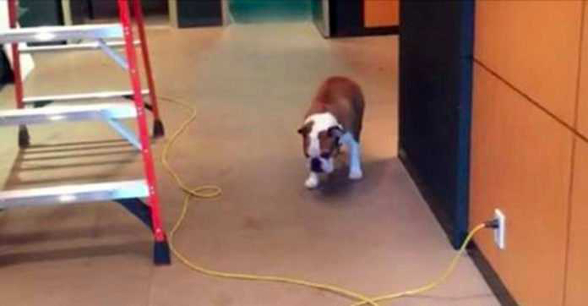 En el vídeo que puedes ver a continuación, vemos con su amo lo filma mientras se encuentran en un pasillo que parece estar en obras. Hay una escalera y un cable justo en medio y el perro se queda paralizado.