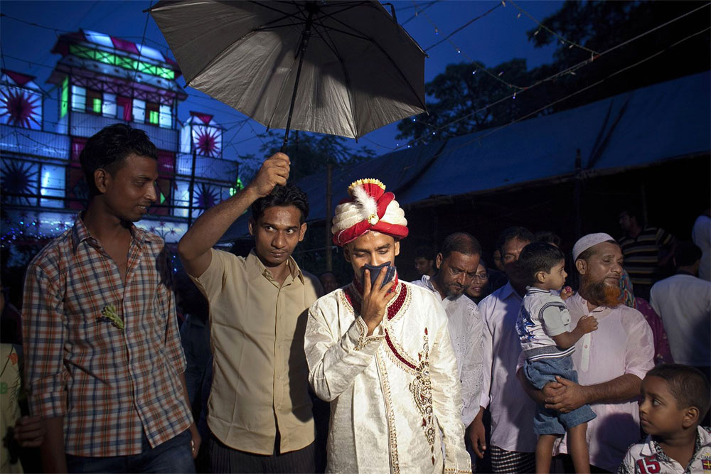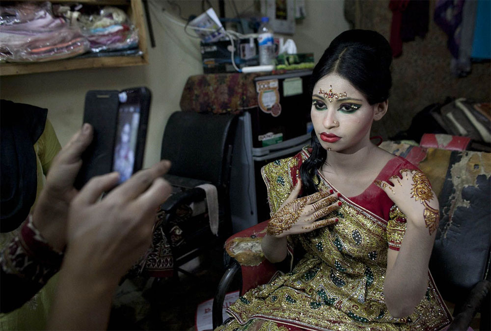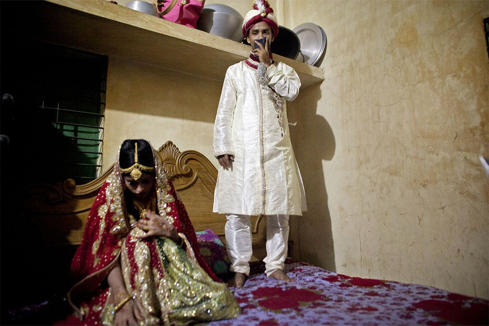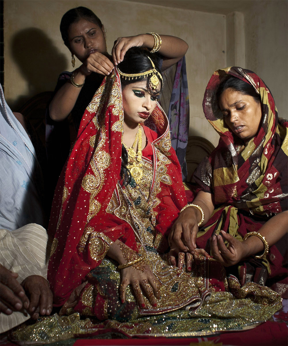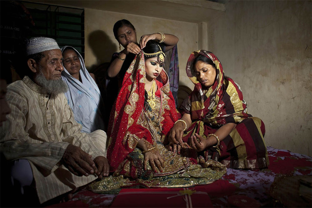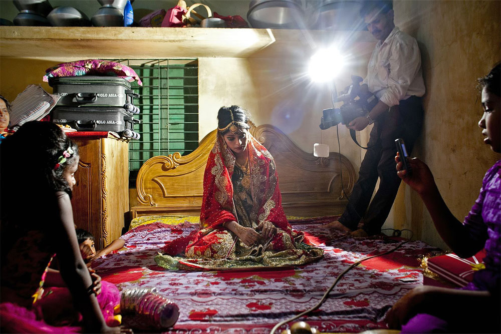 La fotoperiodista Allison Joyce fue asignada por Getty Images en su casa de Bangladesh el pasado verano, cuando pasó una gran carpa de boda que se estableció junto a la carretera. Era curioso lo que estaba pasando, Allison preguntó a un transeúnte que le dijo que la boda se había fijado para el día siguiente, y que habían sido invitadas miles de personas. Pero el detalle que afectó a Allison era el hecho de que la novia tenía sólo 15 años. Al día siguiente, Nasoin Akhter se casó con un hombre que le dobla la edad. Allison volvió a la mañana siguiente con su cámara, y fue recibida en la ceremonia.