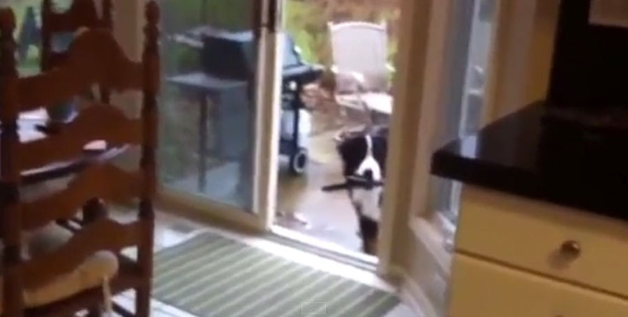 Un perro grande se asoma cautelosamente en la casa, pero mira lo que lleva en su boca…