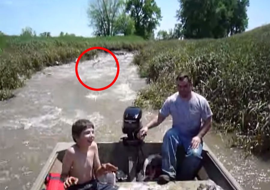 Iban en un bote por un río y de pronto sucedió lo que se ve en el vídeo. Debido a que el río es extremadamente estrecho y las carpas voladoras salta fuera del agua cuando se sienten amenazadas o asustadas, comienzan a aparecer cientos de carpas por todos los lados. Al final el propio bote se llena de peces. Probablemente es una técnica de pesca que aprovecha el comportamiento de estas carpas.