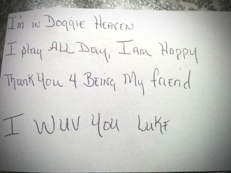 Cuando su amado beagle Moe falleció en abril, Mary y su hijo de 3 años de edad Luke comenzaron una rutina muy especial: Cada noche, los dos se sentaban en torno a la mesa de la cocina y con un bolígrafo y papel en la mano, escribían una carta a Moe.