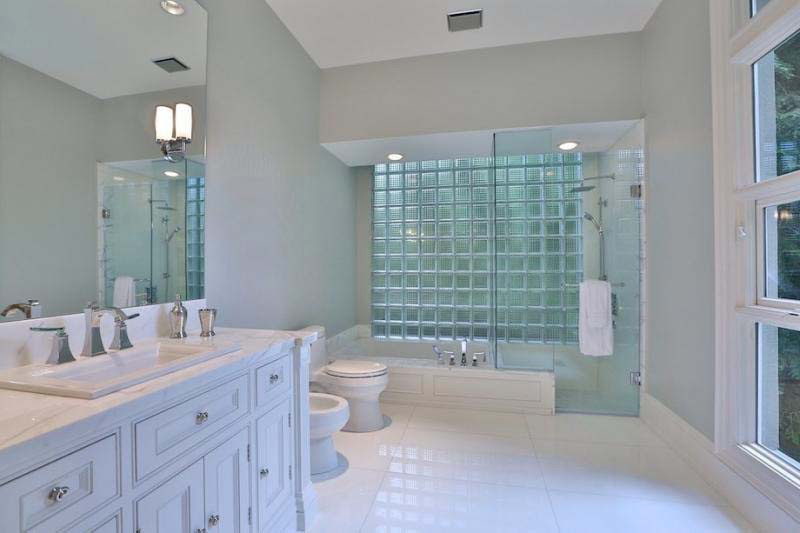 La paleta de color blanco se ve impresionante con los ventanales que llegan hasta el suelo y que dejan entrar mucha luz natural – ¡incluso en el baño! Supongo que cuando su casa tiene una gran puerta no te preocupará demasiado la privacidad.