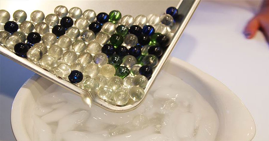Volcar rápidamente las canicas (con cuidado, estarán muy calientes) en el agua helada.