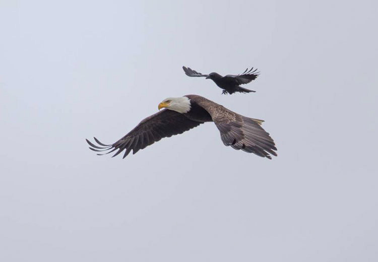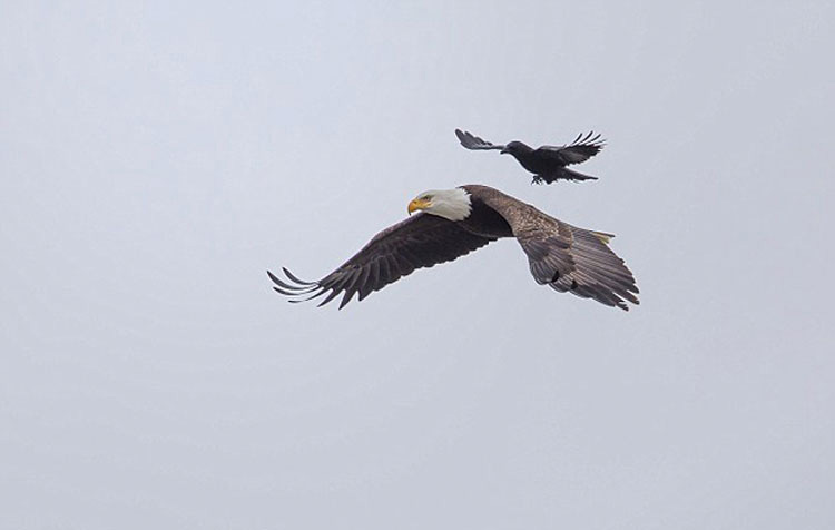 Chan dice: «Los cuervos son conocidos por acosar agresivamente a otras rapaces que son mucho más grandes en tamaño cuando las detectan en sus territorios y por lo general estos ‘intrusos’ simplemente se apartan sin mucho alboroto. Sin embargo, en esta ocasión no parecía que el cuervo hostigara al águila calva y tampoco el águila calva se vio afectada por la presencia del cuervo al invadir su espacio personal. Lo que fue aún más extraño fue que el cuervo incluso hizo una breve parada en la parte posterior del águila como si estuviera tomando un paseo de recreo y el águila simplemente estuviera obligada«.