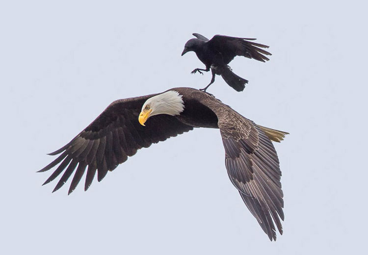 El fotógrafo de naturaleza Phoo Chan, con sede en California, capturó uno de esos momento únicos que suceden una vez en la vida, cuando un cuervo decidió dar un paseo sobre la parte posterior de un águila calva. Según Chan, el águila sorprendente no se vio afectada mientras el cuervo disfrutaba de un breve descanso en pleno vuelo.
