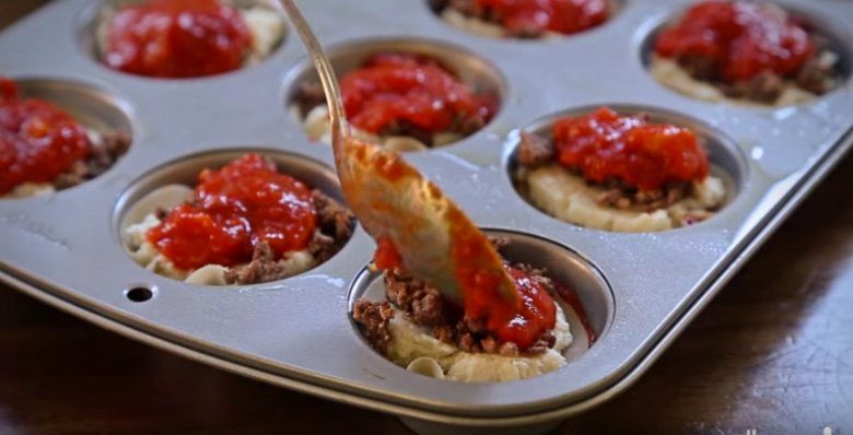 - A continuación poner carne en cada hueco y después salsa de pasta.