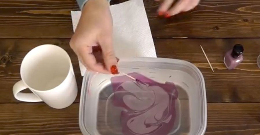 El primer paso es llenar un recipiente profundo de plástico con agua tibia. Tiene que ser lo suficientemente grande como para poder sumergir la taza. A continuación, se vierten unas gotas de esmalte de uñas en el agua y se mezcla con ayuda del palillo. Después hay que sumergir rápidamente la taza en la mezcla y eso es todo.