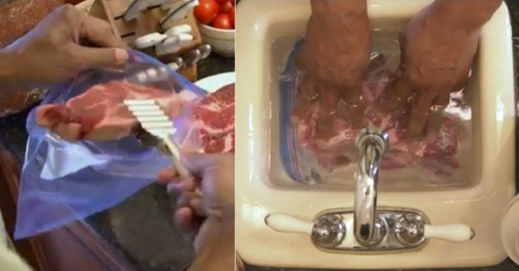 ¿Entonces cuál es la forma más segura para descongelar carne? ¡En el fregadero! Agua fría y bolsitas de plástico de cierre hermético son los mejores amigos. Es una manera perfecta para descongelar alimentos de una manera rápida sin dejar de mantener la temperatura bastante baja.
