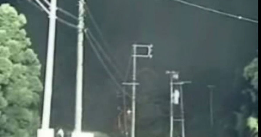 Poco a poco, la carretera comienza a desmoronarse, y de repente todo se viene abajo, incluyendo todos los postes de teléfono que hay al lado de la carretera.