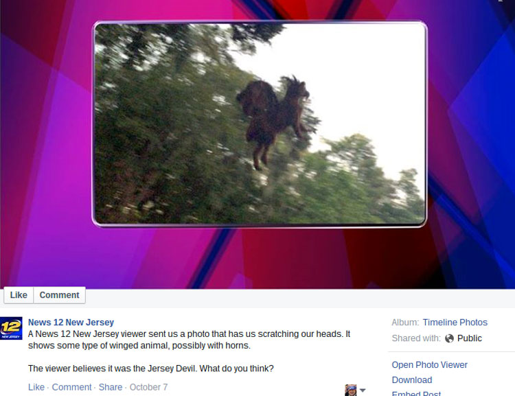 El 7 de octubre de 2015, el canal de noticias News 12 de Nueva Jersey (Estados Unidos) compartió una fotografía en la que supuestamente se muestra el mítico «diablo de Jersey» en su página de Facebook: