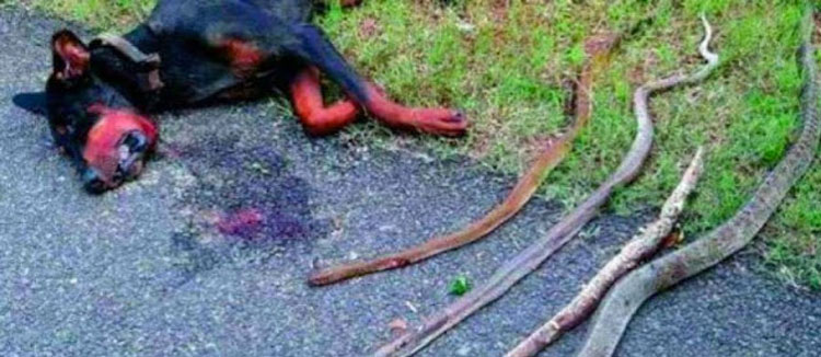 Audazmente, el perro se había lanzado repetidamente contra las serpientes hasta que se aseguró de que todas estaban muertas. Pero unos minutos más tarde, se desplomó en el suelo, totalmente impotente y con una gran cantidad de mortales picaduras. El veneno de las cobras fue demasiado para él.