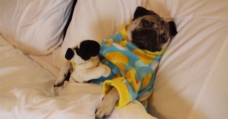 Por si este pug no era ya lo suficiente tierno y bonito, imagínate cómo puede ser de encantador este video cuando Doug está preparándose para acostarse y dormir. Su rutina nocturna consiste en dormir toda la noche con su pijama favorito: el que está lleno de patitos, y acurrucarse junto a su propio pug de peluche, y todo eso sin dejar de mirar a la cámara mientras pone su cara más adorable.