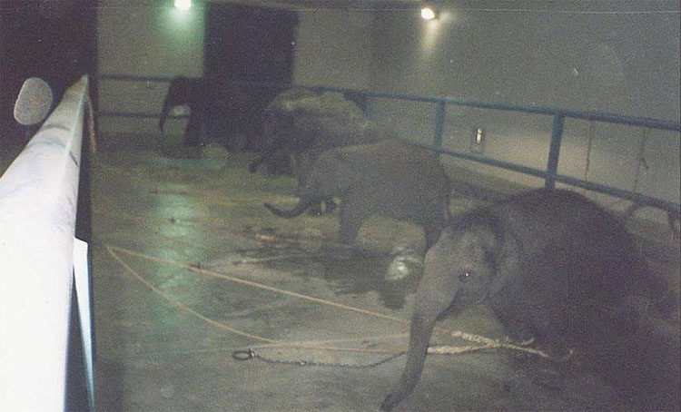 Una foto tomada por Sam Haddock, ex entrenador en los circos de Ringling Brothers and Barnum & Bailey Circus, muestra cómo es la vida de las crías de elefantes nacidas en los circos. En la imagen, una fila de pequeños elefantes se encuentran en un oscuro recinto de hormigón, atados a las paredes con cuerdas y cadenas y, en el caso del más cercano, al parecer, parece luchar por liberarse. Sus madres no están a la vista.