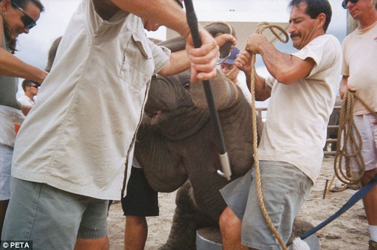 Los «entrenadores» utilizan bullhooks (un palo con un afilado gancho), para pincharles, y otros instrumentos cortantes utilizados para pinchar a los elefantes y conseguir que «se comporten». Cuando varias ciudades de los EEUU prohibieron el uso de bullhooks, el circo Ringling se negó a actuar allí, sabiendo que los entrenadores no podrían controlar a los elefantes sin los temidos instrumentos.