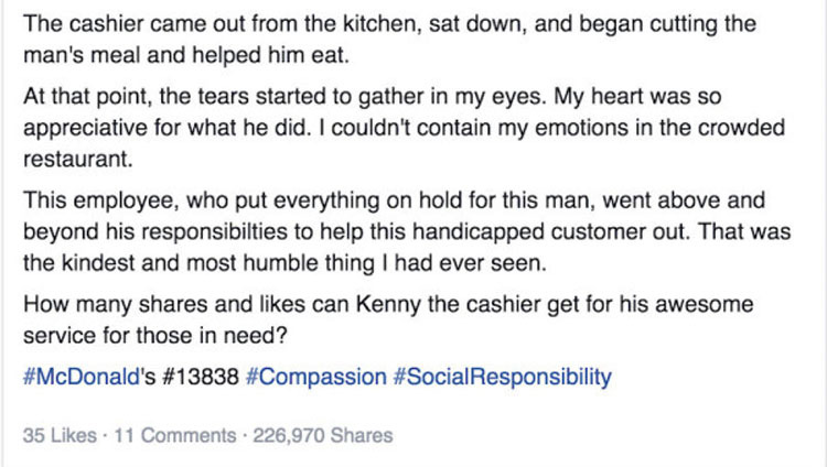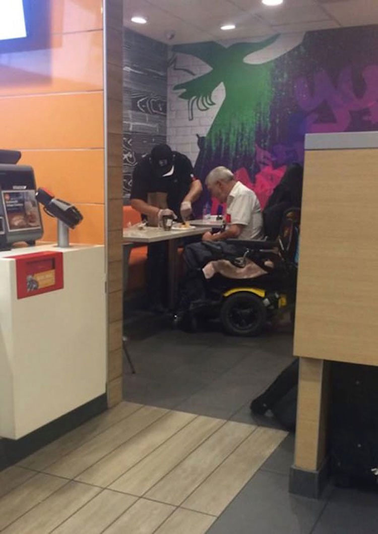 La foto se hizo rápidamente viral con cientos de miles de acciones. Su historia pone una cara amable en el mundo de la empresa de la comida rápida – y de la humanidad en general.