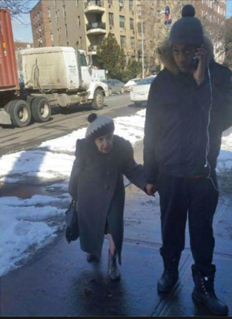 «Hace un par de meses, una señora mayor me pidió acompañarla a su casa porque tenía miedo de resbalar con el hielo. Nos hemos convertido en amigos y ahora caminamos juntos hasta su casa casi todos los días.«, dijo Carl Manley, el joven que acompaña a la señora de la fotografía viral.