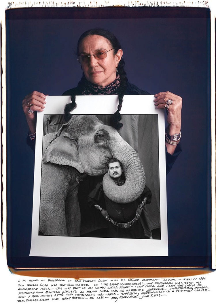 «Estoy sosteniendo mi fotografía de Ram Prakash Singh con su amado elefante Shyama. Tomada en 1990. La fotografía se hizo en Ahmedabad, India«.
