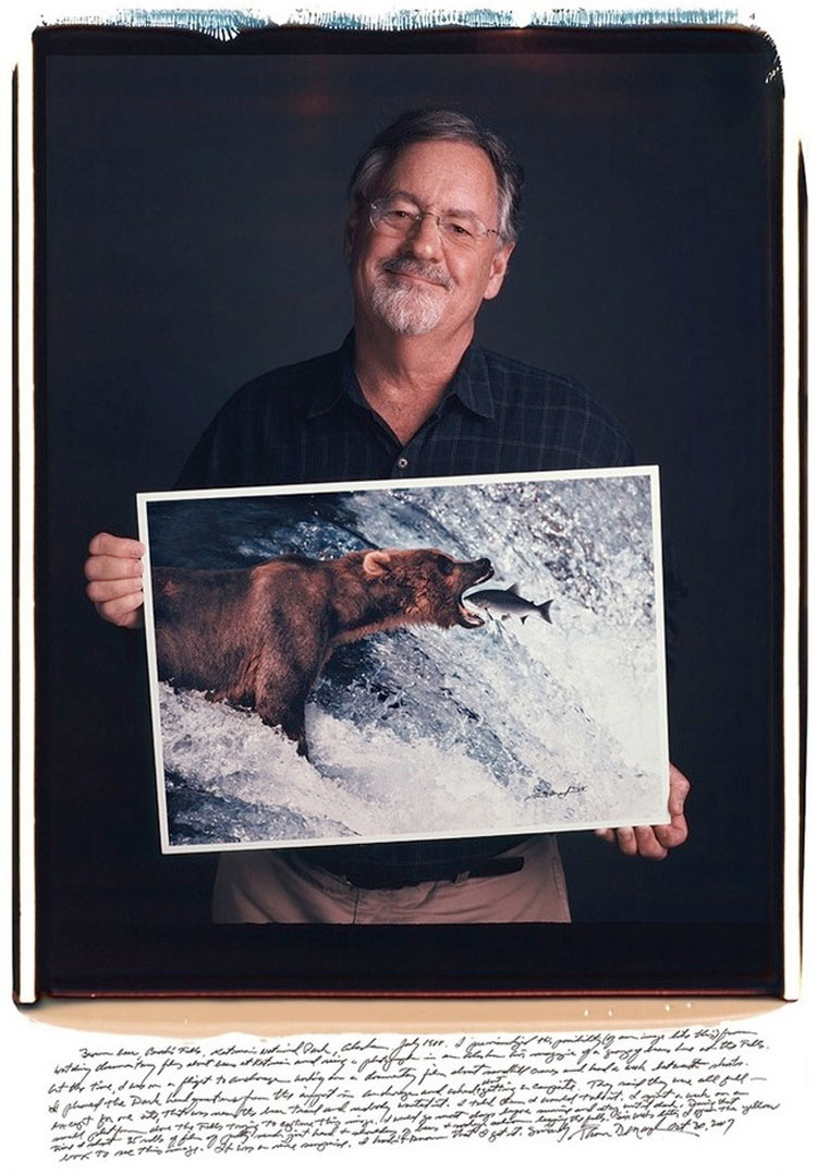 Oso marrón, en las cataratas Brook, Parque Nacional de Katmai, Alaska, julio 1988 – «Pasé una semana en una pequeña plataforma sobre las cataratas tratando de capturar esta imagen. Durante ese tiempo usé 35 rollos de película. Seis semanas más tarde vi la imagen. Fue una agradable sorpresa. No sabía lo que había conseguido«.