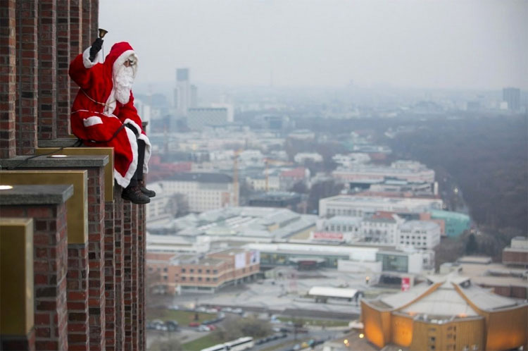 Santa Claus relajándose en la torre Kollhoff de Berlín.
