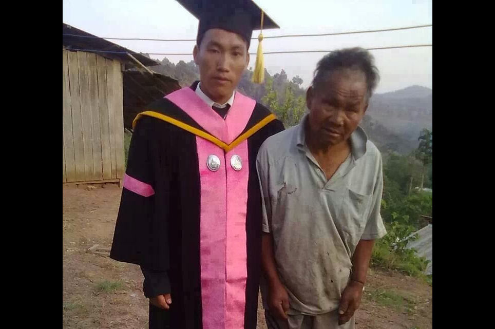 El padre de este muchacho tailandés perdió a su esposa durante el nacimiento de su hijo. Después dedicó toda su vida de trabajo para que el hijo pudiera estudiar. Reciéntemente su hijo se ha graduado en la universidad de Ratchpatr de Tailandia. Con la educación recibida, el hijo finalmente ha podido ganar dinero para vivir y poder hacerse cargo de su padre.