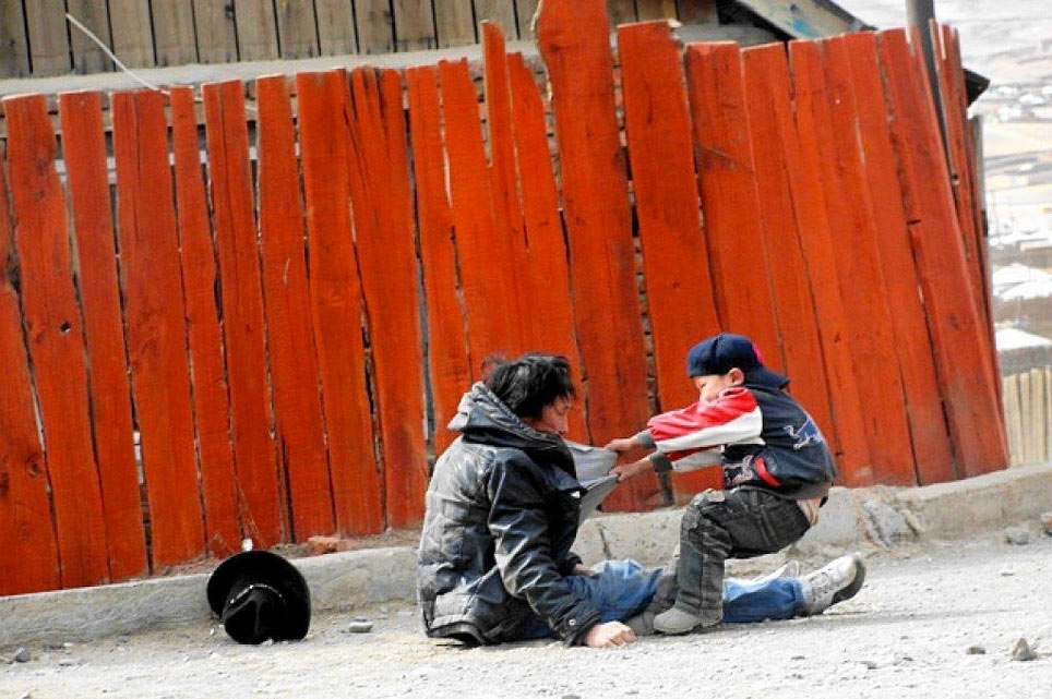 Este niño está tratando de que su padre alcóholico se levante del suelo. Esta triste imagen nos recuerda como el alcoholismo destruye vidas y familias.