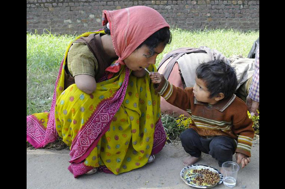 #22. Niño de 2 años dando de comer a su madre discapacitada.