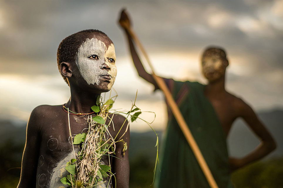 #28. Un niño de la tribu nómada Suri de Etiopía con la pintura corporal y vestimenta tradicional.