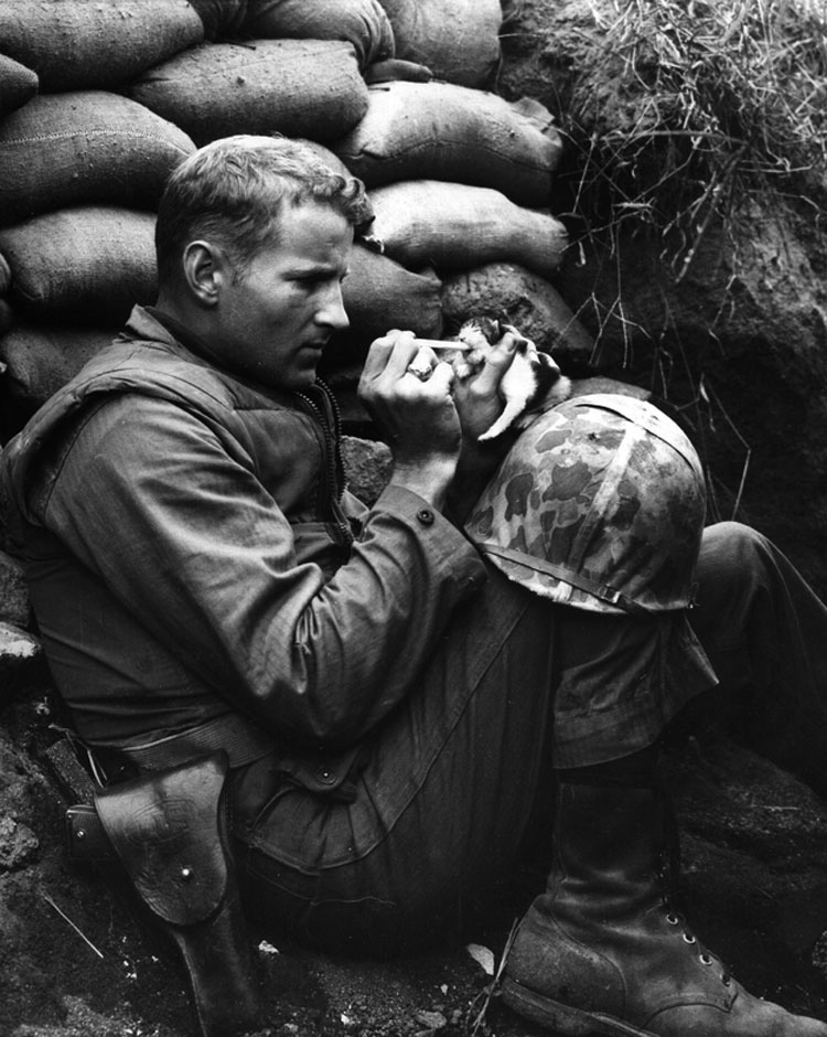 19. Cuando el sargento Frank Praytor alimenta a un gatito de 2 semanas después de que su madre muriese