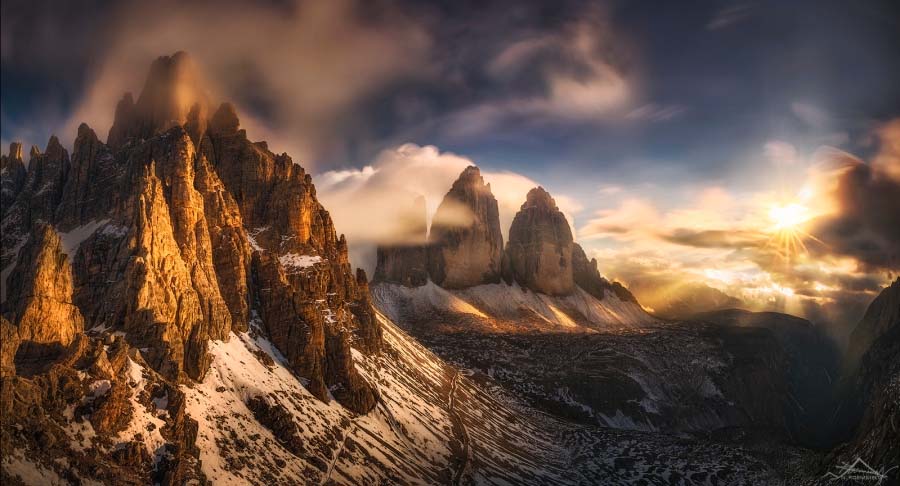12. Amanecer en los picos Tre Cime di Lavaredo, Italia