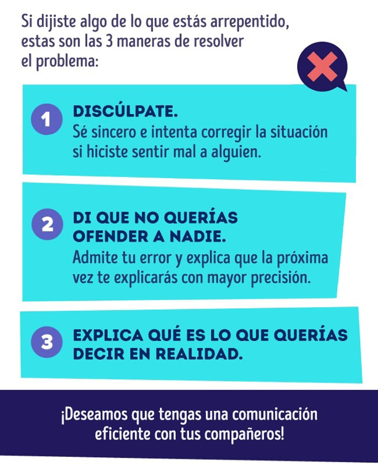 Cuando se trabaja en equipo hay que tener cuidado en qué se dice y cómo se dicen las cosas. Tu opinión puede no coincidir con la de tus compañeros o puede afectar al trabajo en grupo. La relación con los compañeros de equipo debe ser siempre fluida y amistosa, siempre debe encaminarse a generar un buen ambiente que permita superar las dificultades y avanzar en una dirección común y positiva para todos.