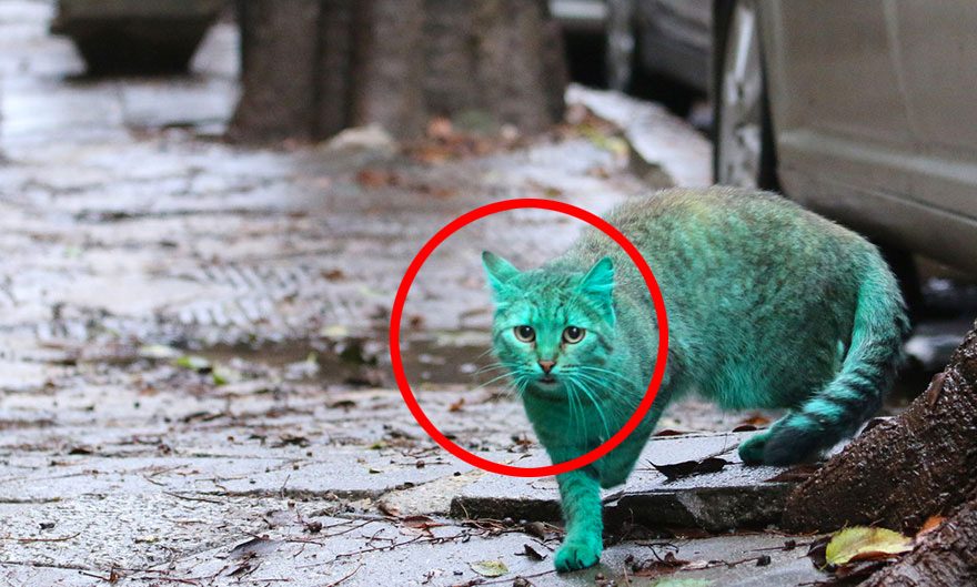 No, no se trata de un truco de Photoshop. Los residentes que viven en Varna, Bulgaria se quedaron bastante perplejos cuando vieron a un gato callejero de color verde brillante
