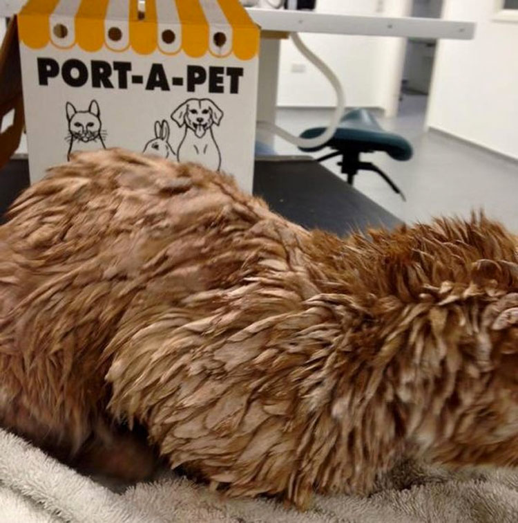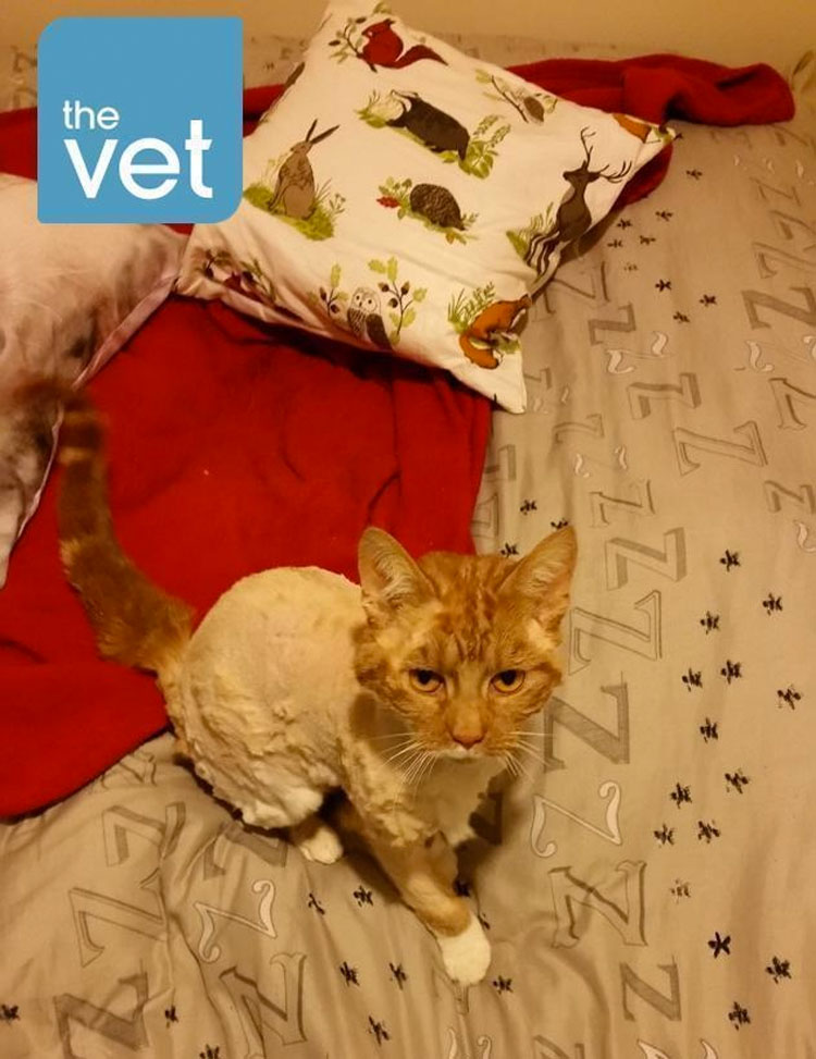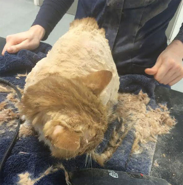 En el veterinario su pelaje fue eliminado por completo, ya que era imposible lavar el cemento del pelo. Había restos de cemento en los ojos, así, que los médicos tuvieron que quitárselo con cuidado.