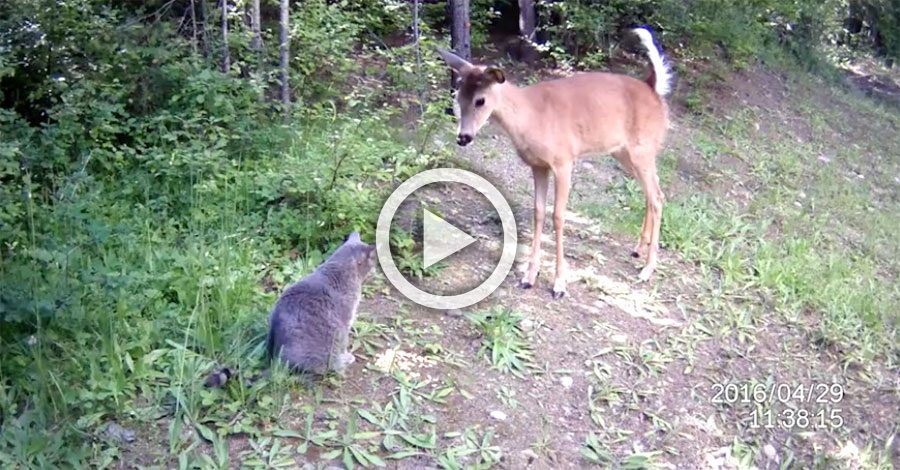 Sorprende a su gato haciendo algo extraño en el bosque. Pero sigue mirando al ciervo …