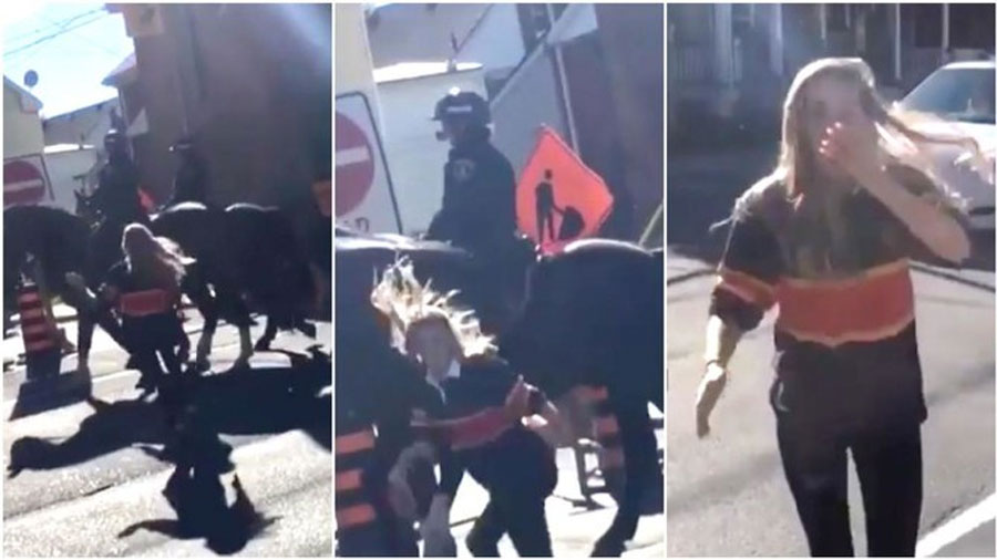 Aunque el caballo de la policía da una patada a la joven del video, la policía de Kingston dijo que su caballo Murney estaba «asustado por las bofetadas que recibía, pero mantuvo su control».