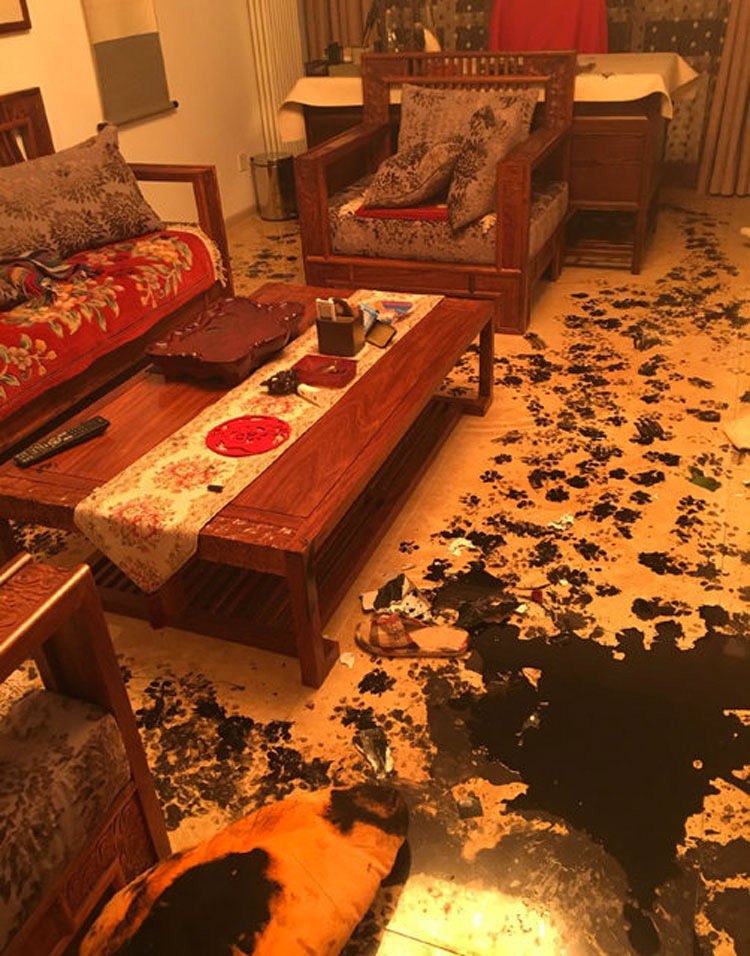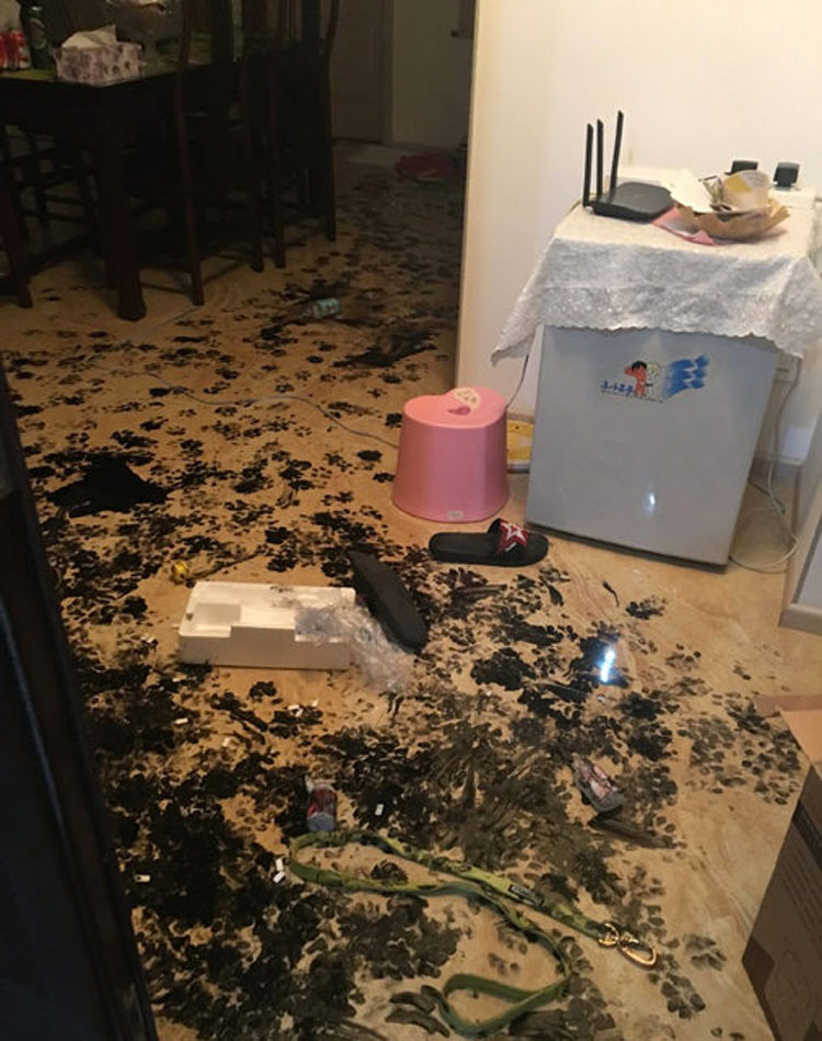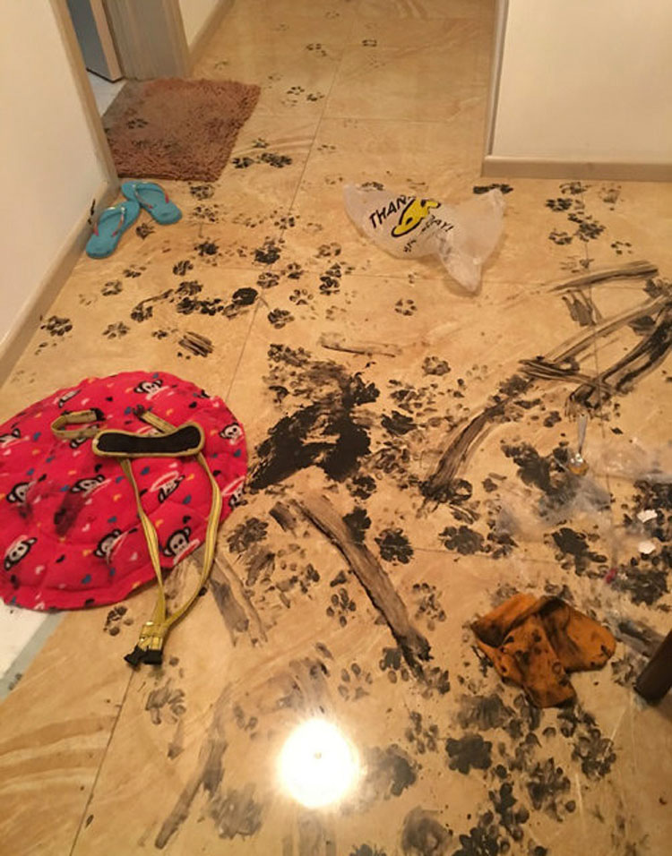 La familia limpió todo el suelo de la casa y a su revoltoso peludo. (Aunque tienen que volver a pintar una de las paredes).