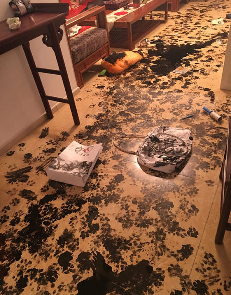 Y tras sumergir sus patas en tinta negra, comenzó a grabar sus huellas por toda la casa.