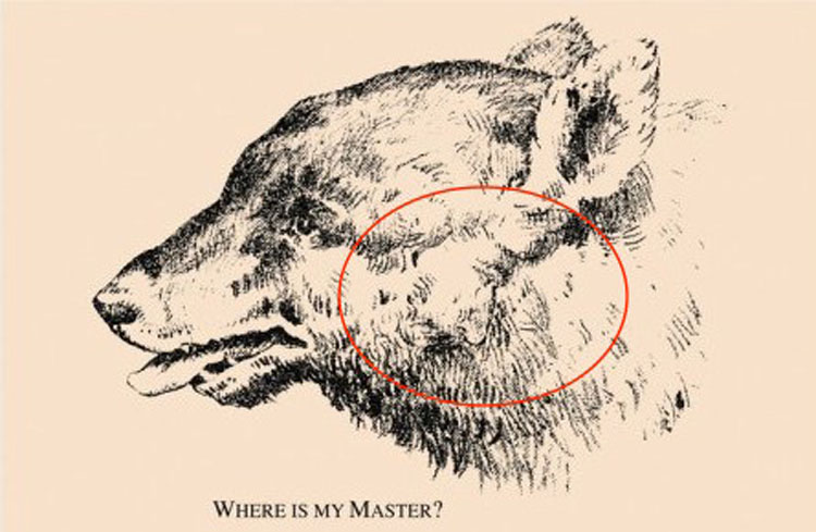 Al principio, sólo se veía como una imagen de la cabeza de un oso, pero había algo más acechando en su trazado y el sombreado de su pelaje. Su título era «¿Dónde está mi maestro?» La tarea del espectador era encontrar al «maestro» del oso en algún lugar de la imagen.