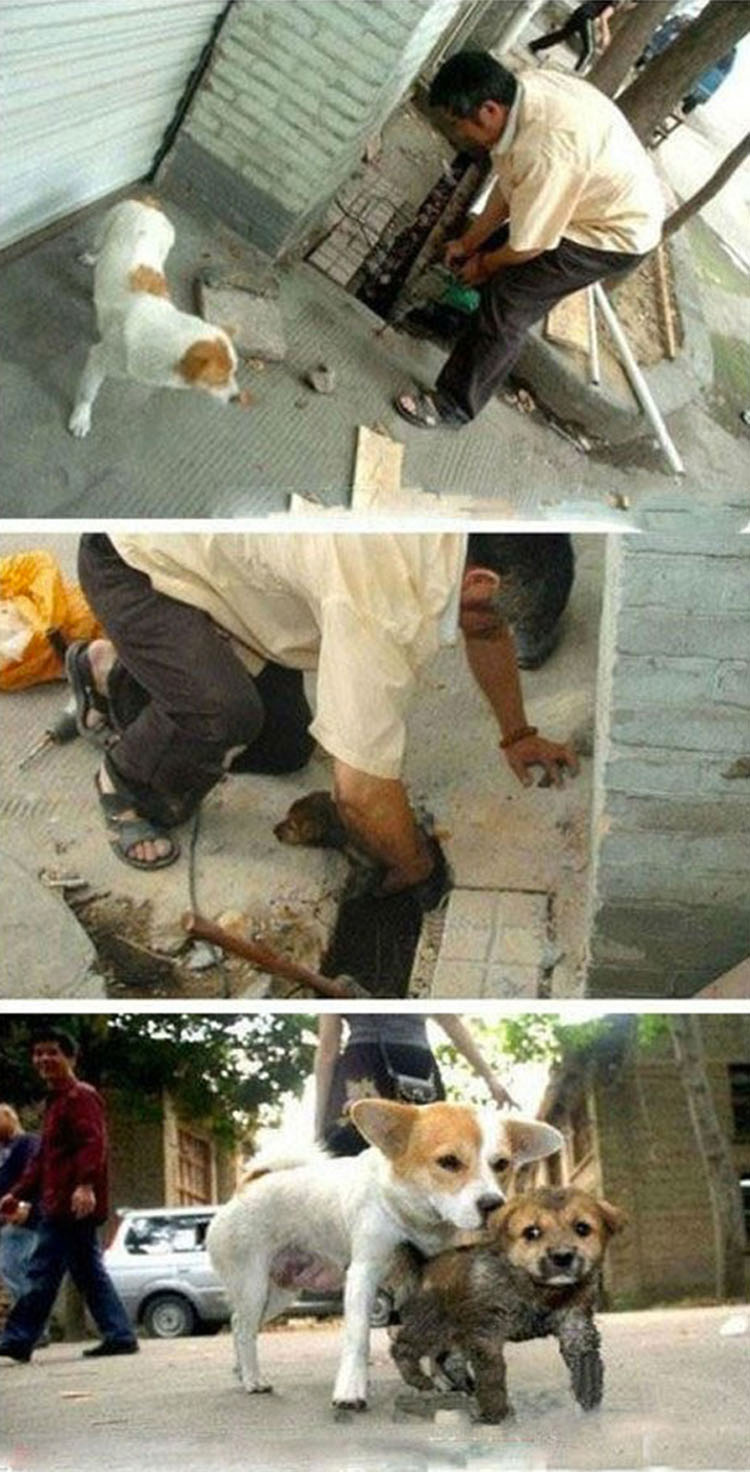 Después de la caída del perrito en un desagüe, un amigo del cachorro insistió en pedir ayuda en la calle. Entonces, llegó un hombre con herramientas, resquebrajó el suelo y con éxito rescató al pequeño cachorro.
