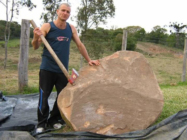 Este es Rogério Bertoldo. Aquí está de pie, con un hacha, al lado de una gran roca.