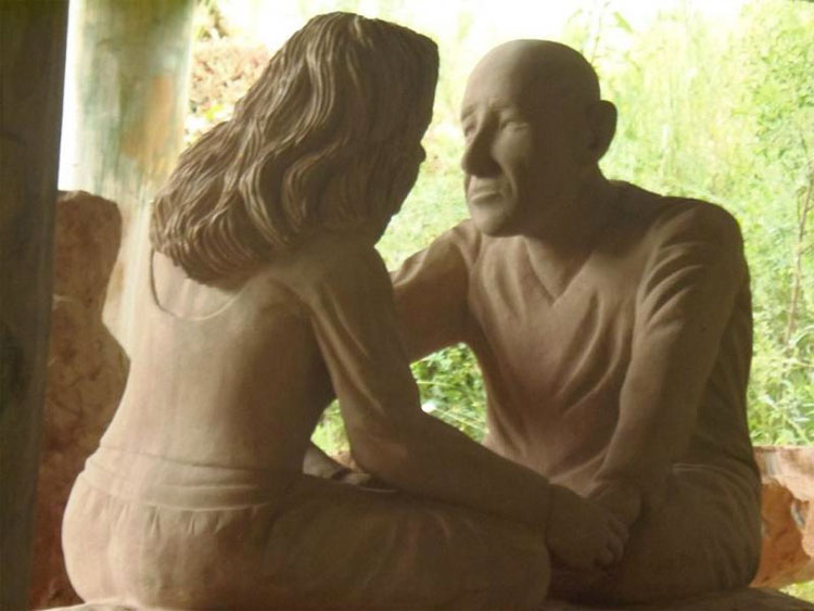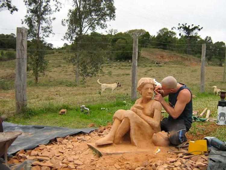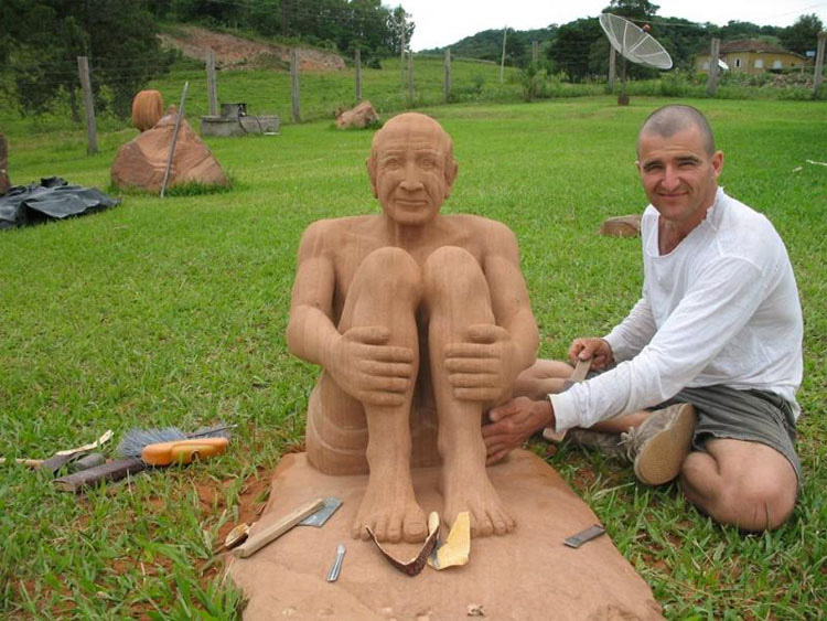 El escultor de talento crea sus obras maestras en piedra y madera. Junto a la de sus padres, también ha tallado estatuas de su esposa y de él mismo.
