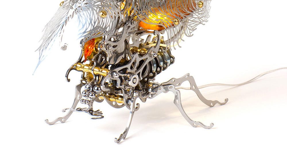 El escultor coreano U-Ram Choe construye esculturas cinéticas a las que les incrusta con CPUs, motores, y LEDs para formar figuras de aspecto orgánico y con un gran componenente artístico. En esta ocasión el artista nos presenta sus dos obras más pequeñas realizadas hasta la fecha, un par de lámparas que parecen insectos y que acertadamente las ha llamado Lámpara «Insecta» Plata y Lámpara «Insecta» Oro. Cuando se encienden, las luces revelan un conjunto ornamentado formado por cinco alas que se mueven con un aleteo suave. Te recomendamos que las veas en funcionamiento en el vídeo que aparece en este artículo.