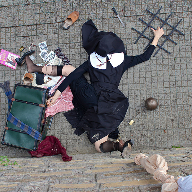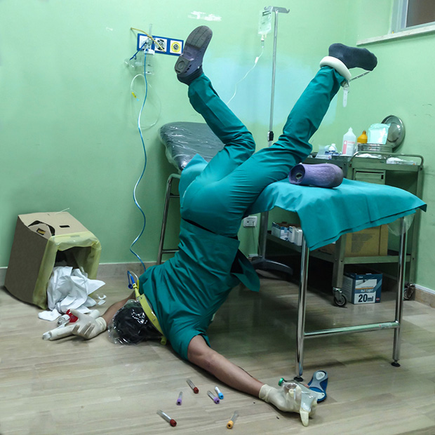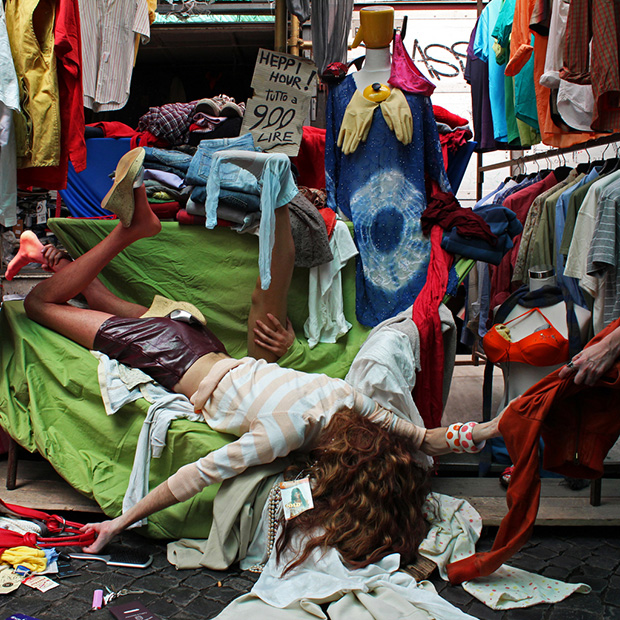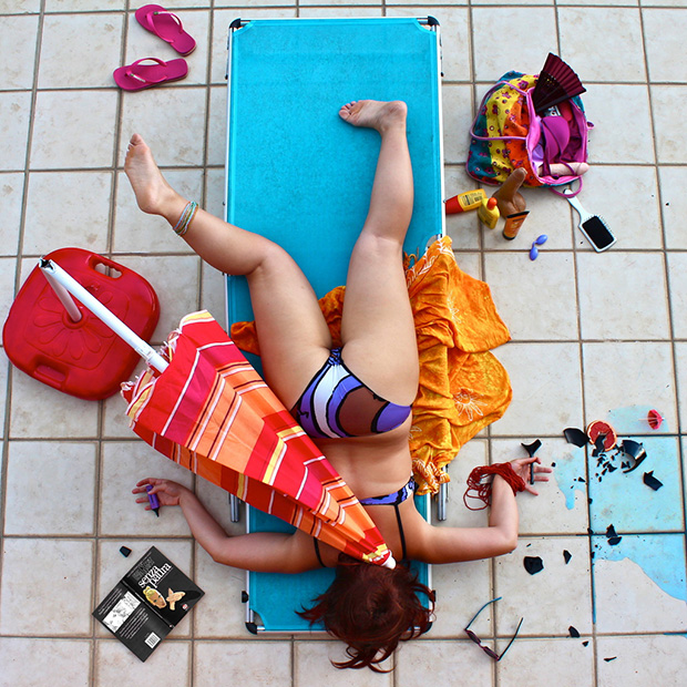 El fotógrafo italiano Sandro Giordano retrata e inventa para su obra In Extremis, elaboradas escenas que se producen cuando alguien se cae, deleitándose en el instante retratado de la vergüenza que tan a menudo sigue a una caída pública. En estos momentos calamitosos, el fotógrafo interrumpe las rutinas de personajes reconocibles como: el cirujano, la monja o el cumpleaños de una muchacha, para revelar el absurdo y patético mundo que subyace bajo la superficie de la vida diaria.